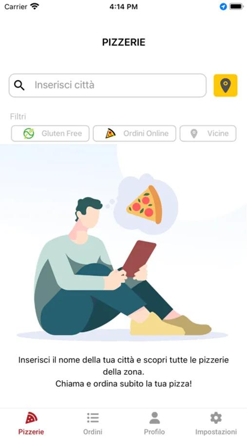 E' una applicazione che ti permette di iscriverti ad una piattaforma dove puoi cercare e chiamare le Pizzerie vicine a te o vicino a dove vuoi tu. Nella piattaforma puoi ordinare direttamente tramite App la pizza alle pizzerie che aderiscono alla piattaforma. Più veloce di un motore di ricerca, più comoda da usare della tua rubrica è uno strumento di cui non potrai più fare a meno. Con l’apposito filtro visualizzi le pizzerie certificate "Senza Glutine".
