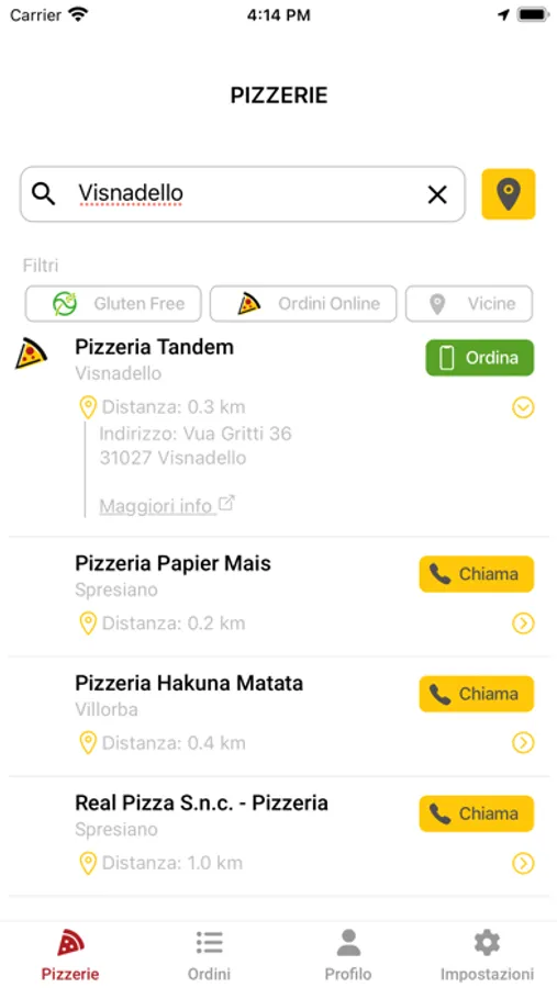 Oltre ad indicare la distanza delle varie pizzerie e permetterti di telefonargli, puoi visualizzare l'indirizzo completo o navigare nel sito istituzionale cliccando "maggiori Info".