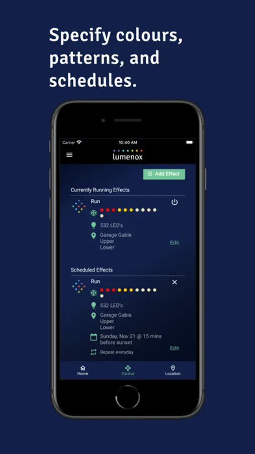 Control your Lumenox permanent LED smart lighting. Choose patterns and effects, set schedules, and organize the lights on your home.