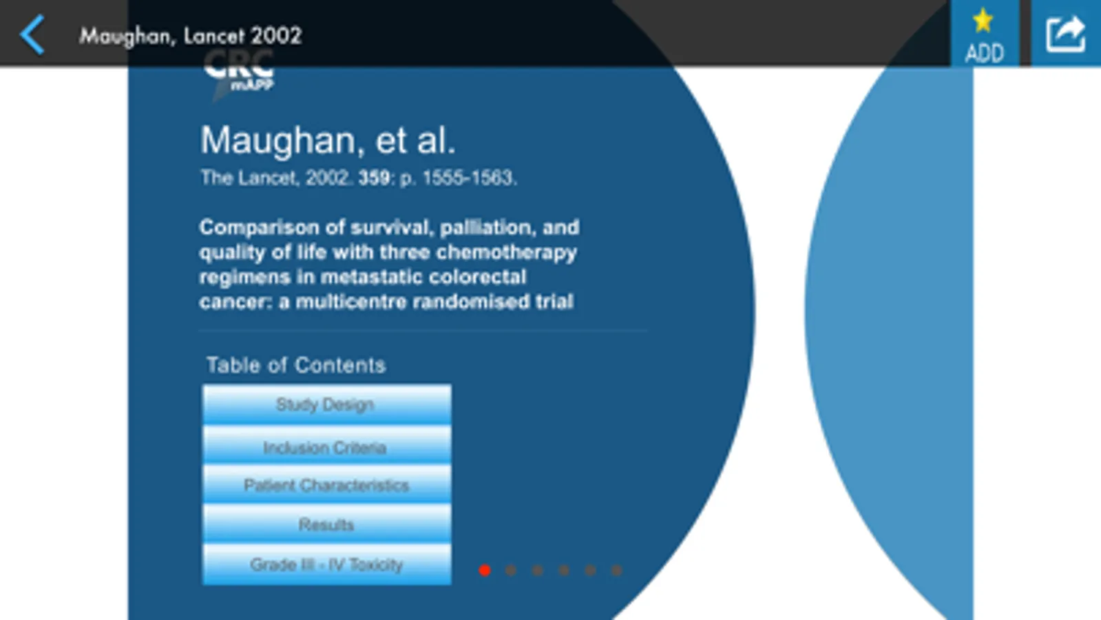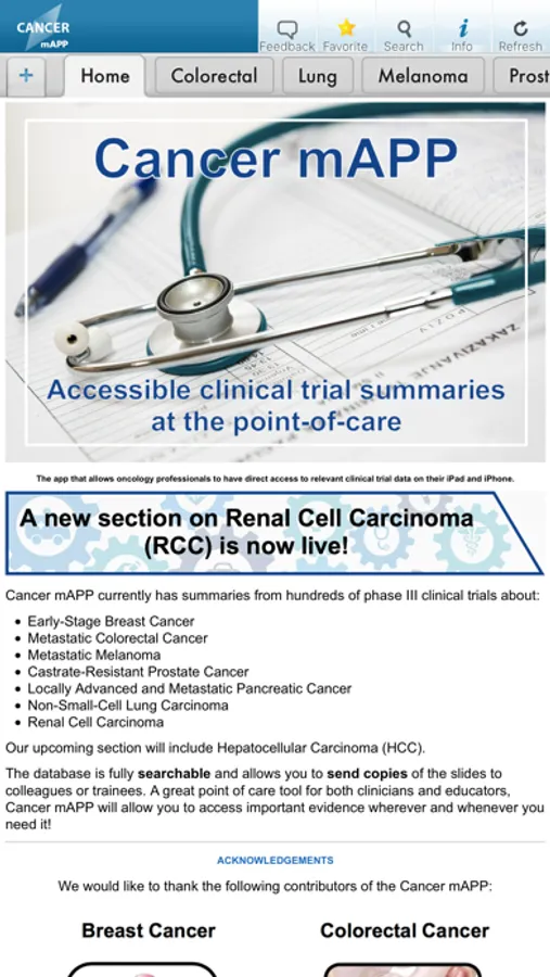 Cancer mApp is the first iOS application that allows oncology professionals to have direct access to relevant clinical trial data on their iPad. Cancer mApp has summaries from hundreds of clinical trials conveniently organized and clearly presented in concise sets of summary slides. The database is fully searchable and allows you to send copies of the slides to colleagues or students. A great point of care tool for both clinicians and educators, Cancer mApp will allow you to access important evidence where and when you need it!