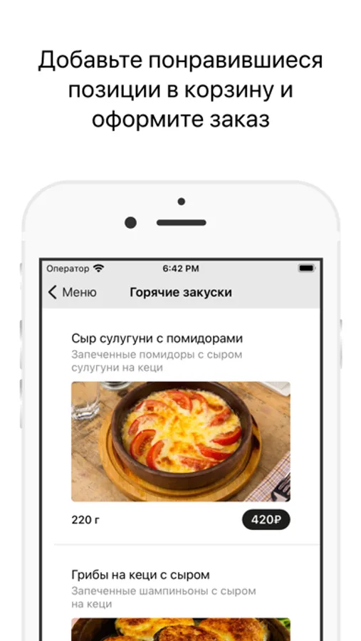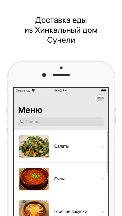 Как сделать заказ в приложении “Хинкальный дом Сунели”: выберите понравившиеся позиции из меню, добавьте их в корзину и перейдите на экран оформления заказа (по нажатию на иконку корзины).
