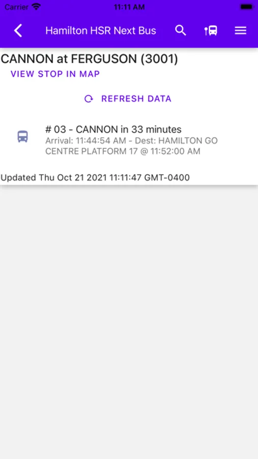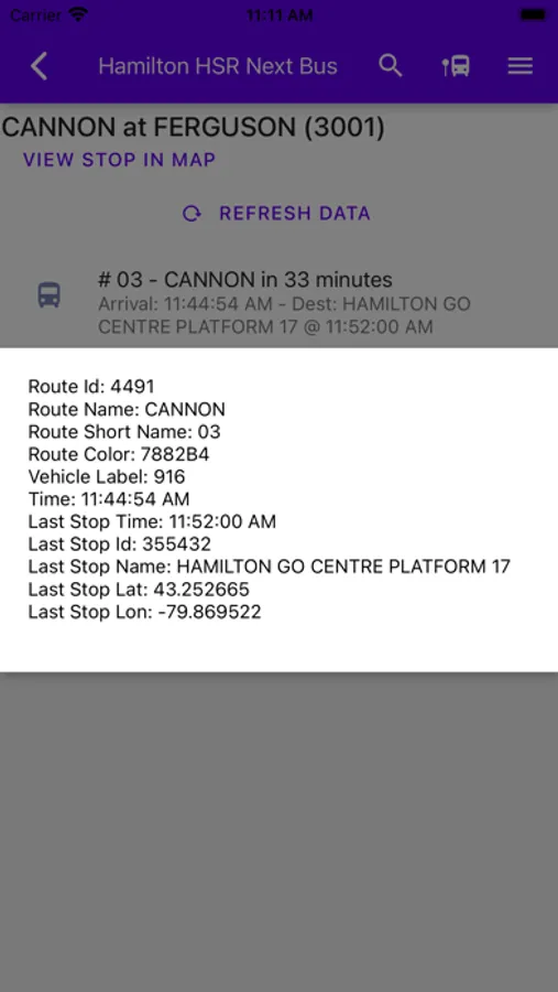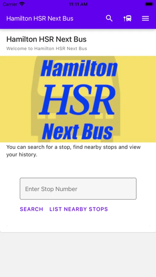 The Hamilton HSR Next Bus App will list all busses at a stop including when they are arriving and where they are going. Data is in real-time from Hamilton's Open Data GTFS (Transit Feed System). You can also use it to find nearby stops. You can get details (bus speed, etc.) on the bus by clicking on it. You can also search your stop number in the home screen or using the Search button.