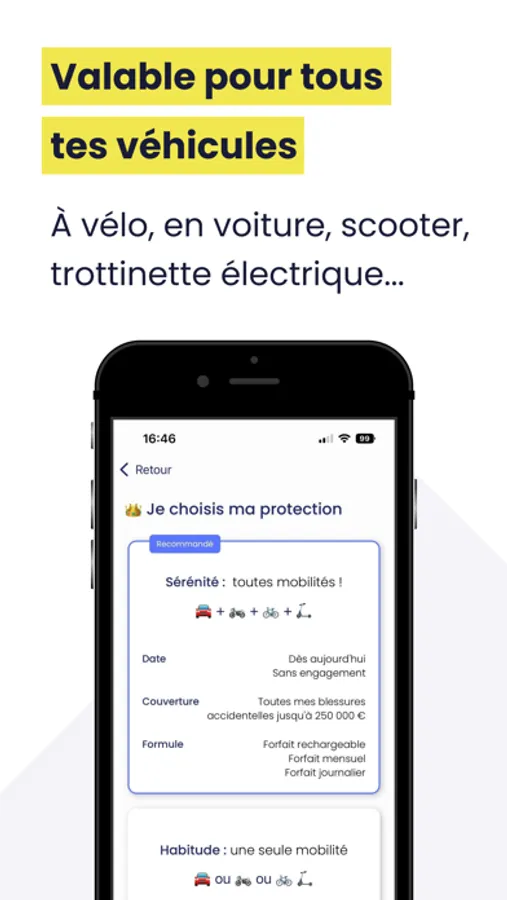 - PROTECTION : Bicyclette, scooter, voiture, moto, trottinette, vous pouvez vous assurer pour un ou plusieurs moyens de transport avec une seule police pour tous les véhicules et un tarif toujours au plus juste, car basé sur votre exposition réelle au risque.