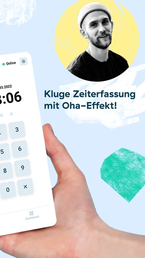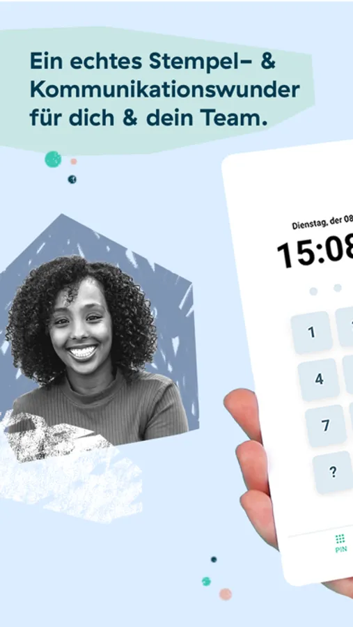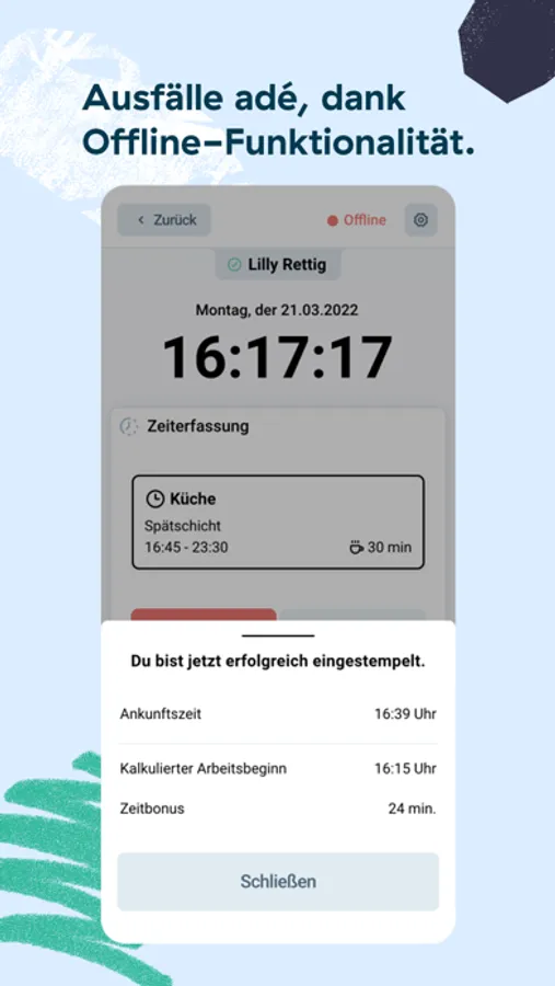 - Zeiterfassung (Ein- und Ausstempeln, Pause stempeln, Überstunden beantragen, Nachricht hinterlassen) → und das alles auch offline