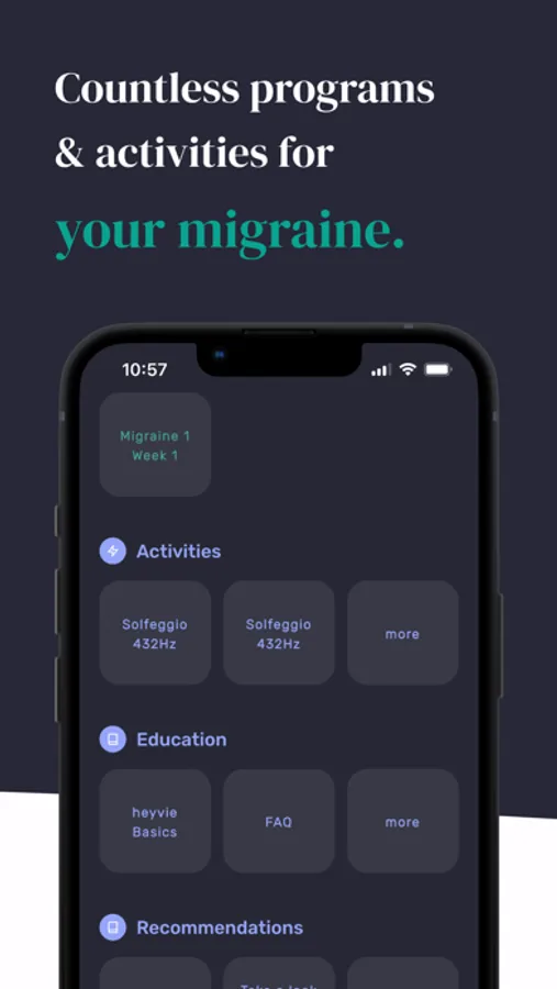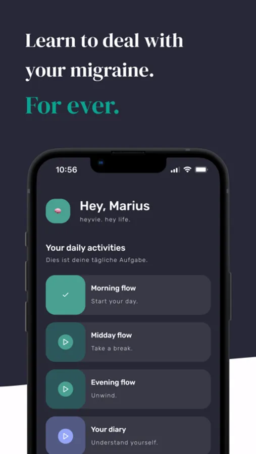 The heyvie app is your digital migraine coach: use a neurological program, a migraine diary und many more pieces of content to change the ay you think, feel and act about your migraine. You will learn to deal with your migraine long term and find the exercises, that really benefit you.