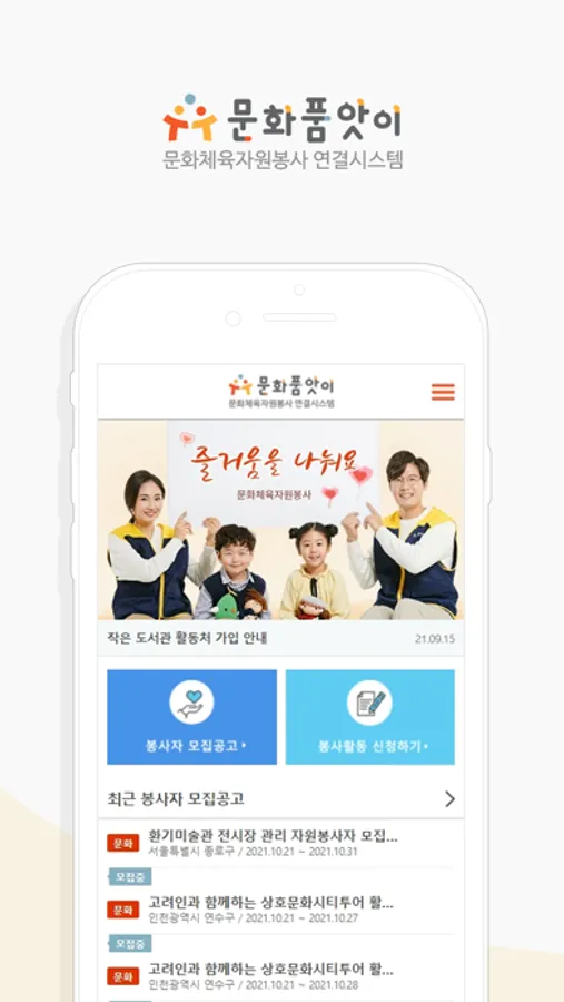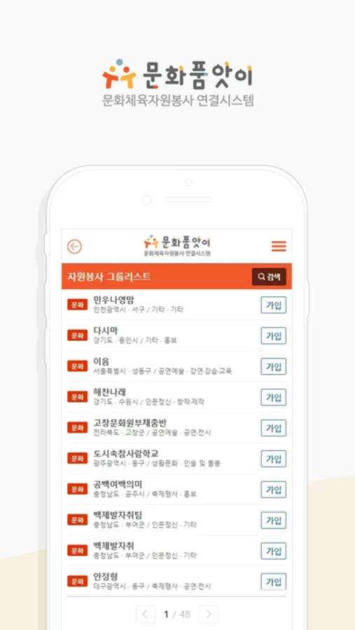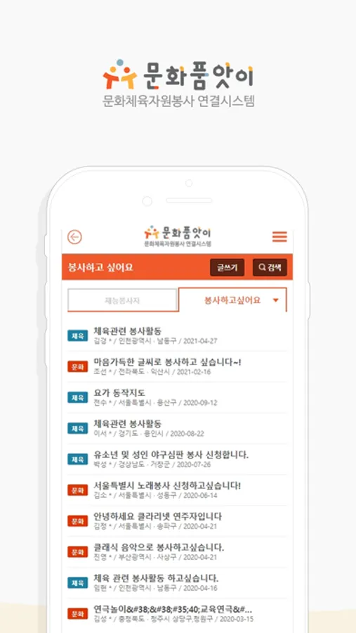 문화품앗이에서는 문화 · 체육 분야의 시설 및 단체 등은 봉사자를 모집 관리 할 수 있으며, 개인, 동호회, 전문가들은 봉사자로서 자신에게 맞는 다양한 문화 체육활동에 참여할 수 있습니다.