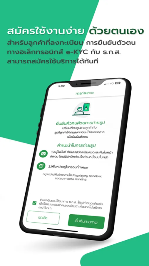 เพียงแค่ลูกค้าลงทะเบียนพิสูจน์ตัวตนและยืนยันตัวตนทางอิเล็กทรอนิกส์ (e-KYC) ลูกค้าก็จะสามารถสมัครใช้บริการ ธ.ก.ส. BAAC Mobile ได้ในทันที