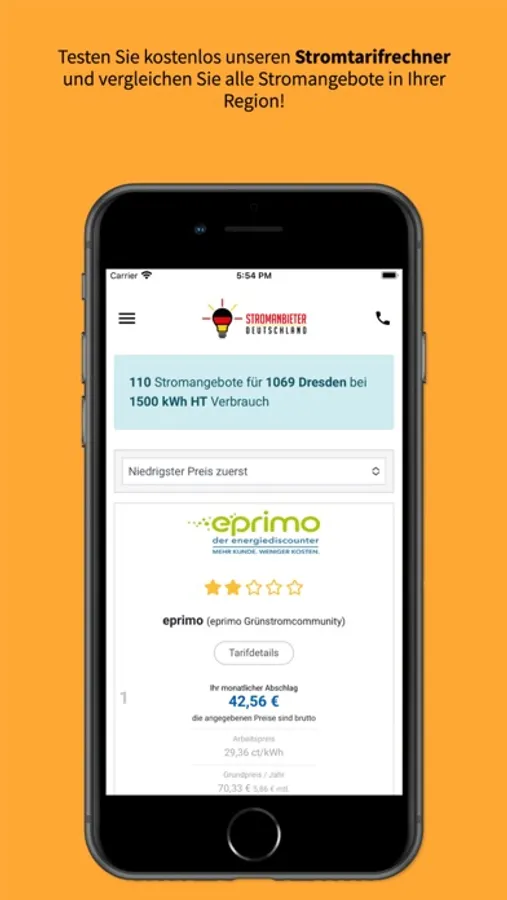 Nach der Dateneingabe besteht die Möglichkeit die günstigsten Stromangebote nach eigenen Kriterien aus der Ergebnisliste zu sehen und auszuwählen.