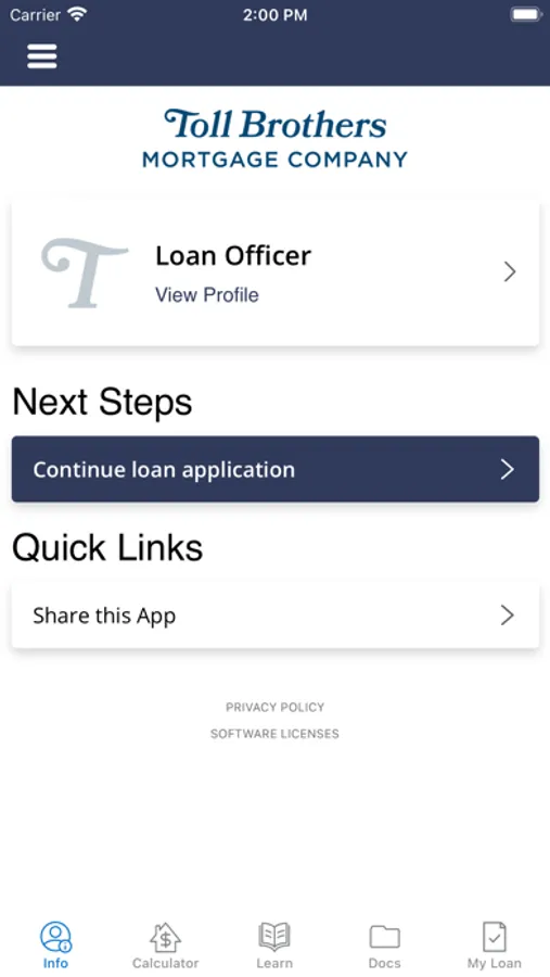 The calculations provided by the Toll Brothers Mortgage: Mobile App are useful in giving you an idea of what homeownership might mean for you. However, please be sure to contact your Toll Brothers Loan Officer for a customized solution tailored to your specific financial situation, needs, and goals. Your Loan Officer can also assist you with any questions you have about your loan and the loan approval process.