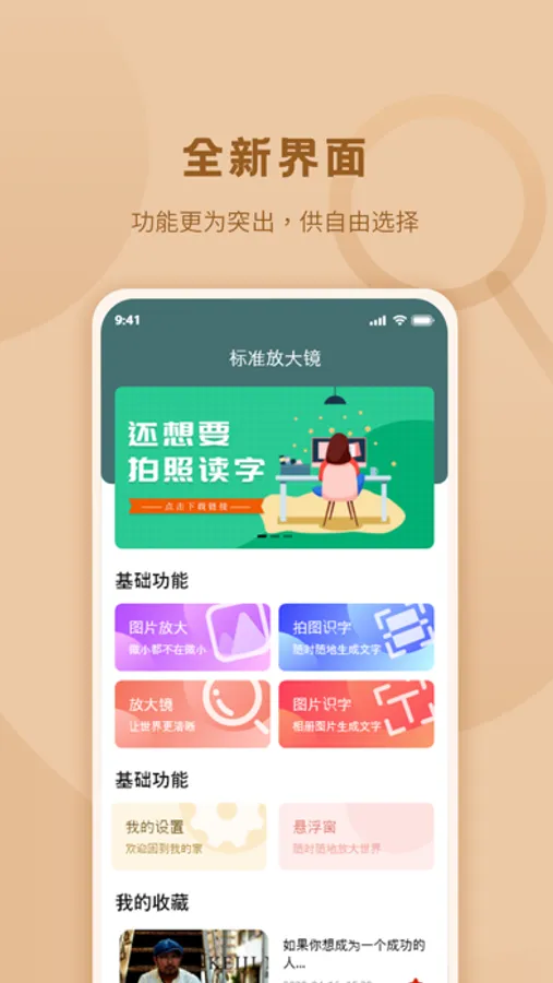 标准放大镜是一款放大图片和文字识别的免费软件,报纸、杂志、药物食物配方文字太小,看不到?打开标准放大镜就能帮您轻松阅读,您也可以将放大内容识别为文字,并且还可以实时翻译,方便快捷。