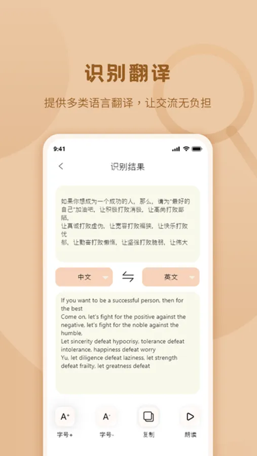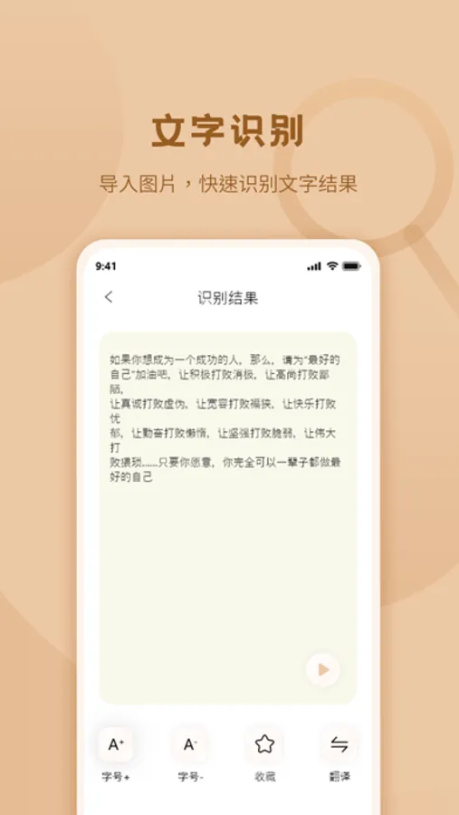 1,拍图识字:拍摄要识别的图片,便可一键提取图片中的文字,您可以根据需求放大文字,便于阅读,还可以朗读和实时翻译,简单好用。