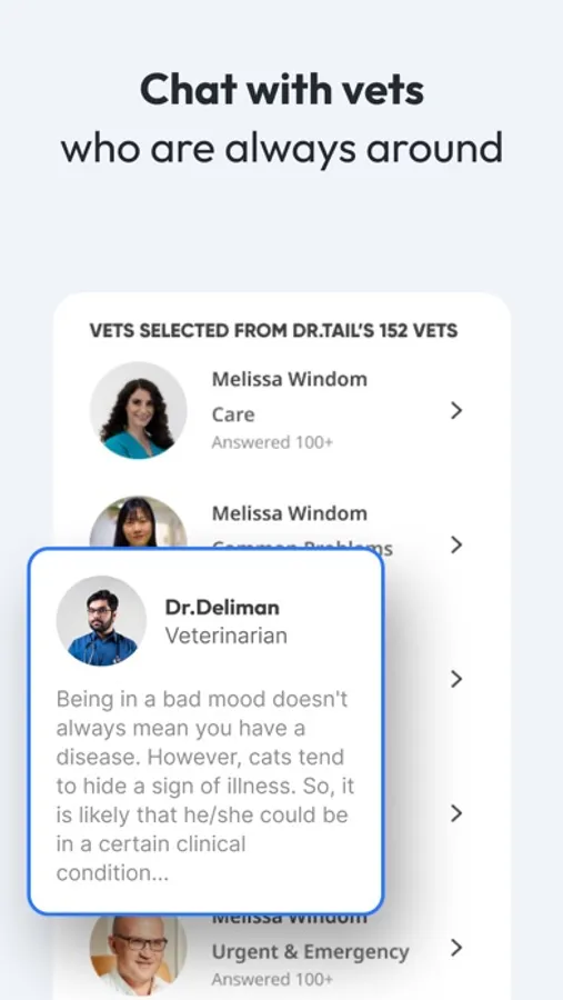 It's difficult to get an appointment with your vet and the ER is so expensive. So, We provide answers from licensed vets in 30 minutes. And 76% of unnecessary vet visits were reduced through Dr.Tail.