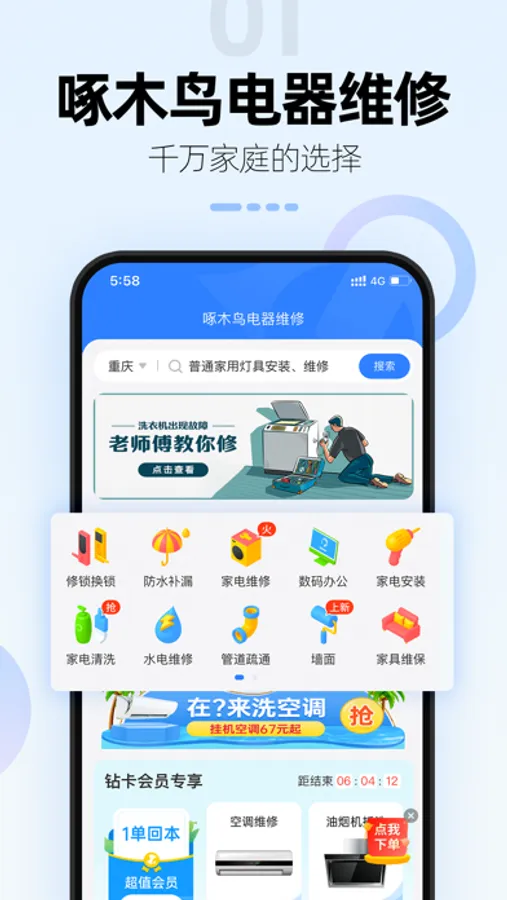 啄木鸟电器维修是一款便捷的到家服务APP,包含上门维修、清洗、安装、开锁换锁、防水补漏、管道疏通等服务,多个持证师傅遍布全国各大小城区,全面实现半小时迅速抵达。