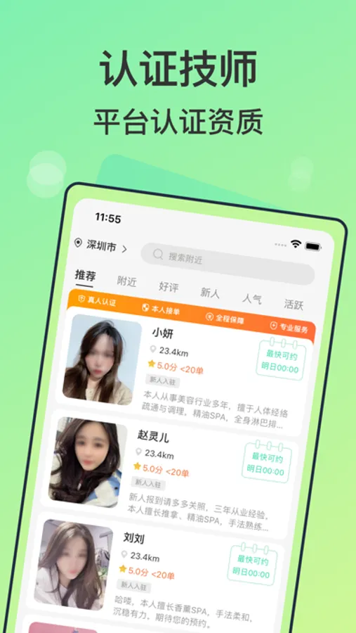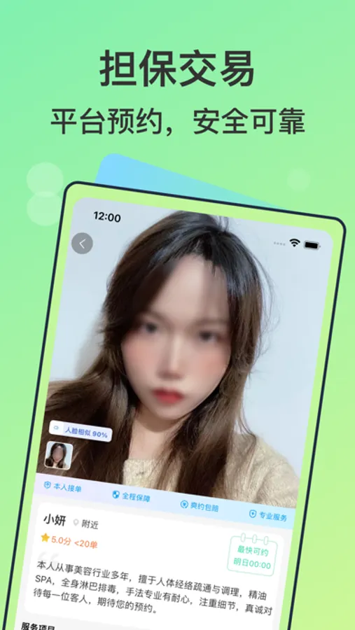 平台提供双重服务保障、所有技师通过人脸认证,平台资料认证、价格更是优惠,服务更到位。一键预约,安全在家享受!
