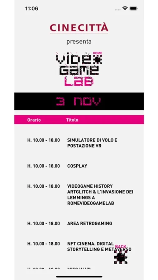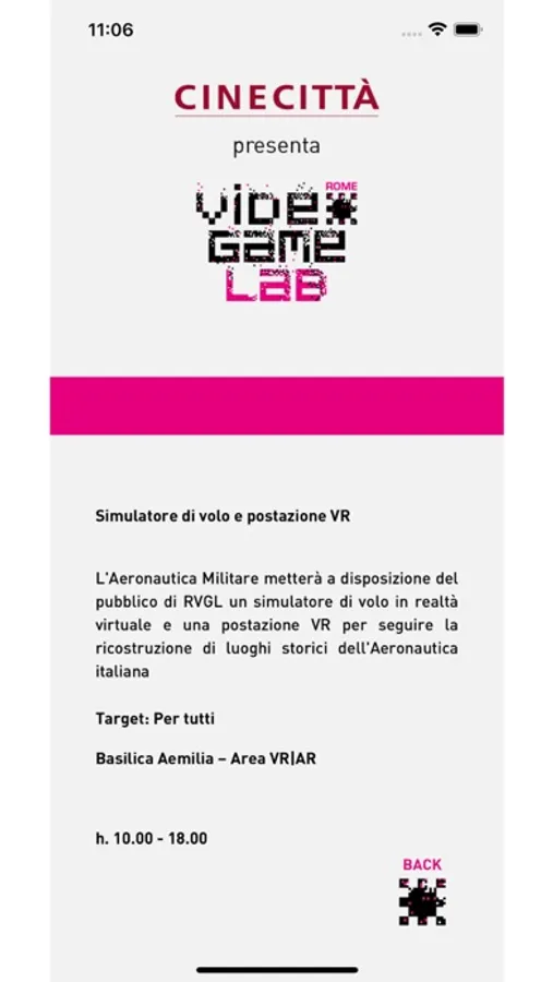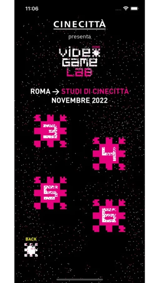 Con l'app di Rome Videogame Lab puoi orientarti e consultare il calendario dell'evento videoludico più grande di Roma. All'interno troverai una mappa interattiva ed i link per registrarti agli eventi che si terranno dal 3 al 6 novembre. Inoltre, guarda le immagini nella galleria e trova tutte le informazioni riguardo biglietti, ingresso e come arrivare a Cinecittà.
