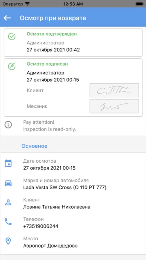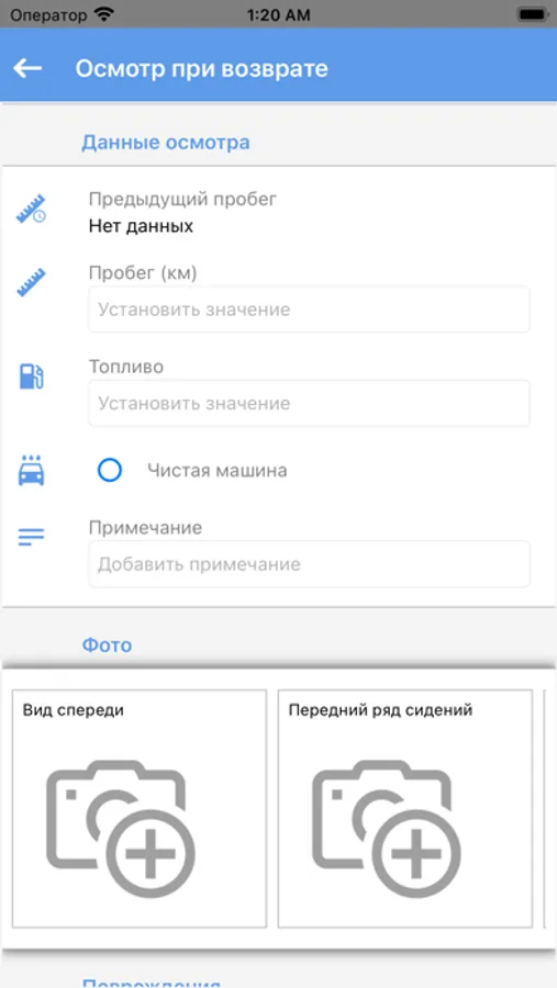 При проведении осмотра заносятся данные о состоянии автомобиля на момент проведения осмотра: пробег, чистота и список новых повреждений. Так же можно увидеть информацию о прошлых повреждениях. В осмотры и повреждения добавляются фотографии напрямую с камеры устройства. По завершении осмотра акт подписывается графической подписью.