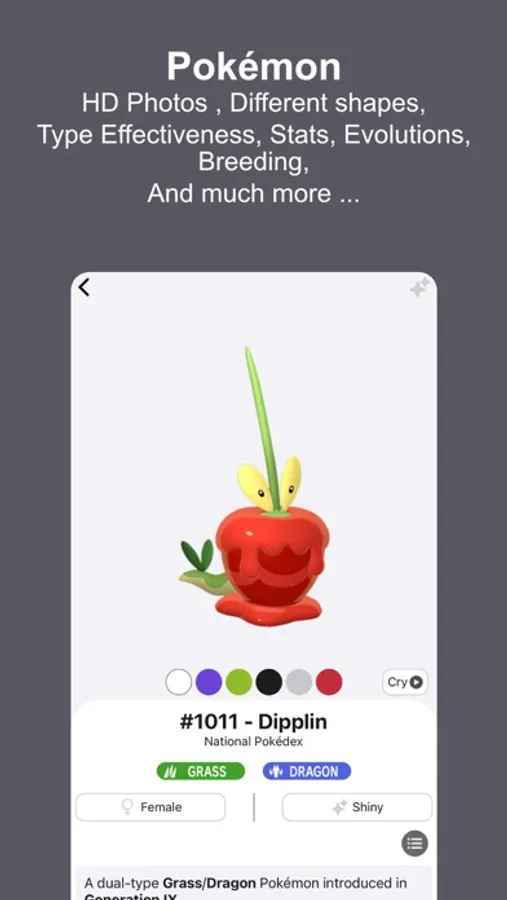- Different forms, type effectiveness, stats, breeding, abilities, evolutions and much more ...