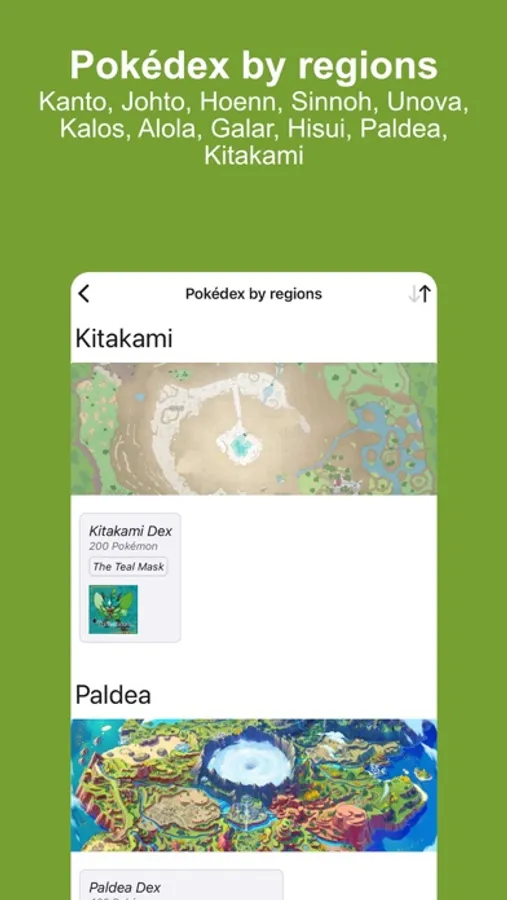 - Regional Pokédex (Kanto, Johto, Hoenn, Sinnoh, Unova, Kalos, Alola, Galar, Hisui, Paldea, Kitakami ...)