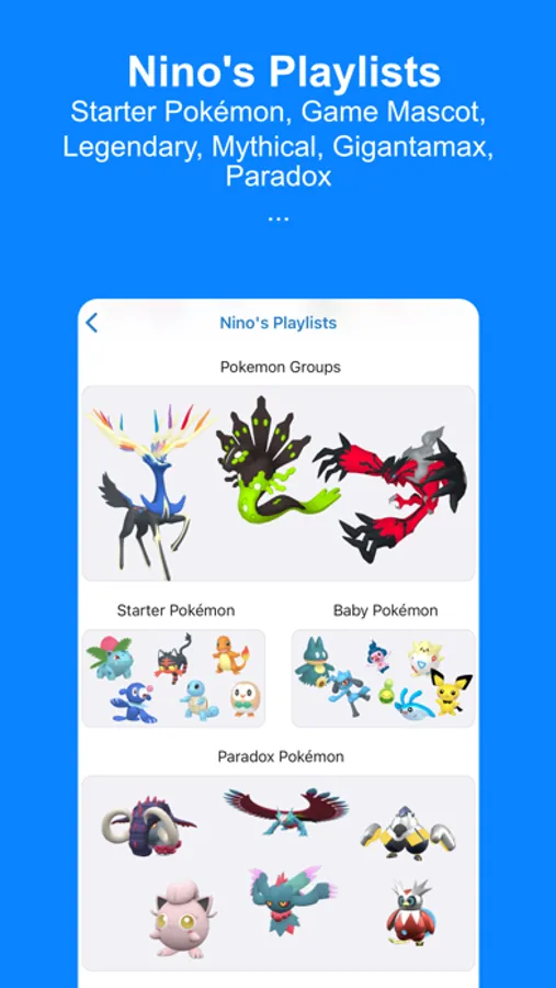 - Nino's Playlists : starter Pokémon, game Mascot, legendary, mythical, gigantamax, prehistoric, Ultra-Beast, Paradox ...