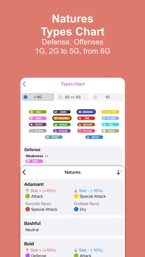 - Types Chart : defense, offenses for 1G, 2G to 5G, from 6G.