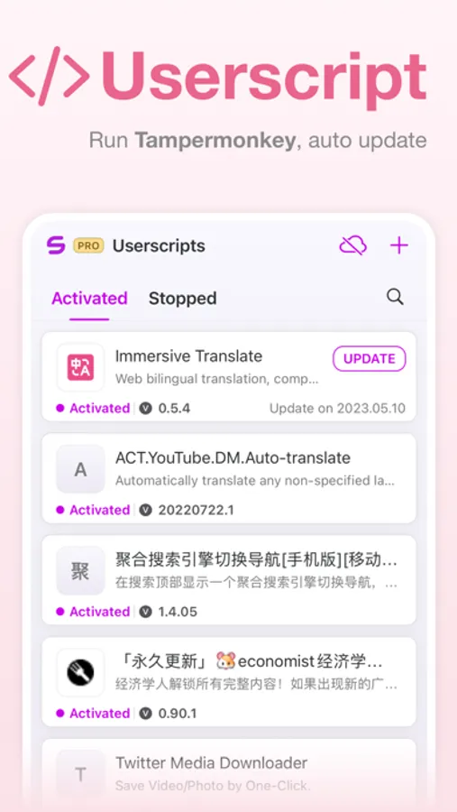 - Userscripts: Install or write your own Greasemonkey or Tampermonkey scripts to enable automatic page turning, immersive translation, anti-redirect, and aggregated search functions, among others.