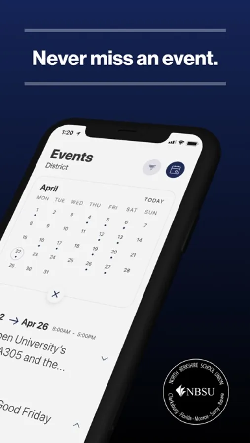 The event section shows a list of events throughout the district. Users can add an event to your calendar to share the event with friends and family with one tap.