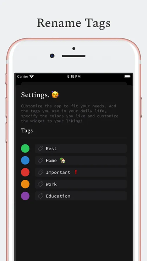 We offer a handy tagging system, name them to suit you and add emoji to make it easy to track your activity. You can also track your activity for the day with a handy widget where each cell is a new day.