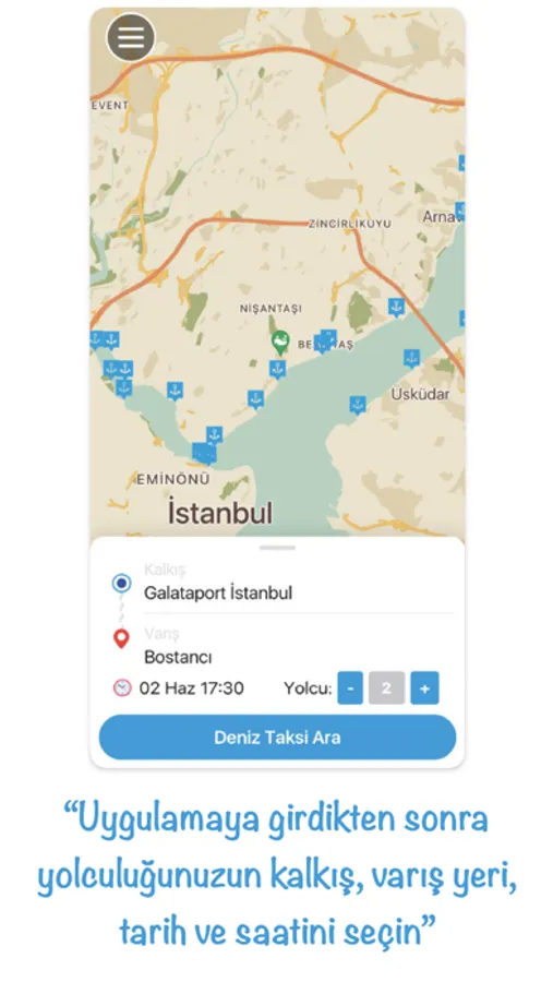 -Deniz Taksi mobil uygulamamız, yolculuklarınızı daha kolay ve keyifli hale getiriyor. Trafik sıkışıklığından kaçarak, şehir hatları iskeleleri arasında hızlı ve konforlu bir yolculuk yapabilirsiniz.