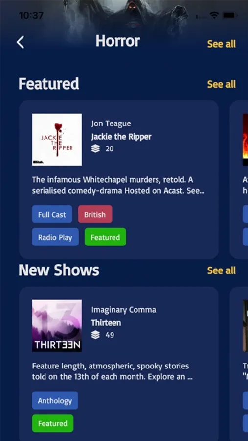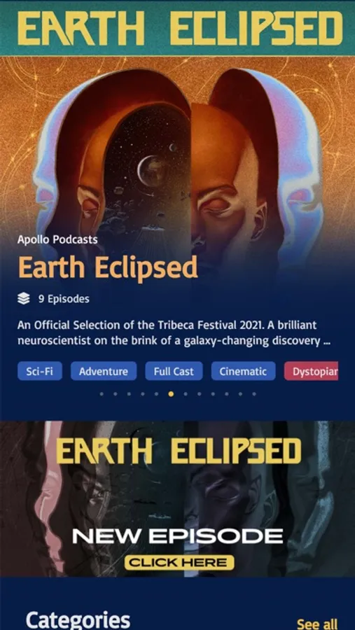 Apollo is the home of fiction podcasts. It is the best place to discover and listen to audio fiction. Explore a library that includes ONLY fiction shows (and nothing else). Discover new audio fiction like a pro, with shows categorized by Genre (with 18 genres including drama, sci-fi, and actual play), by Format (narrator, full cast, audiobook, etc.), and by even more tags. Find your new favorite show in over 20 playlists curated by actual humans: seasoned audio drama creators and long-time fans of the medium.