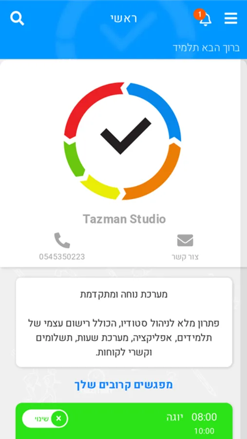 אפליקציה Tazman Clients מעניקה ללקוחות שרות זמין, נוח ונגיש מכל מקום להרשמה לשיעורים, מפגש, חוגים וקורסים בצורה חדשנית, נוחה ופשוטה לתפעול.