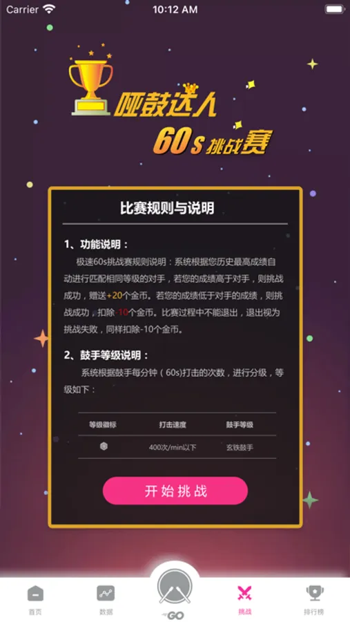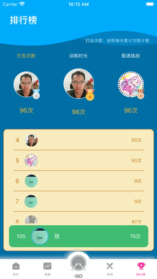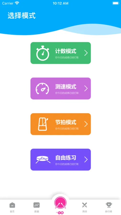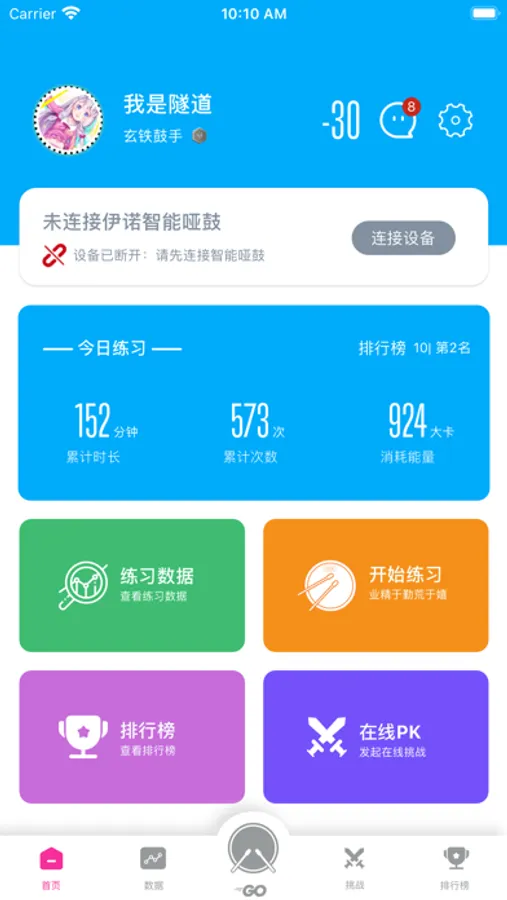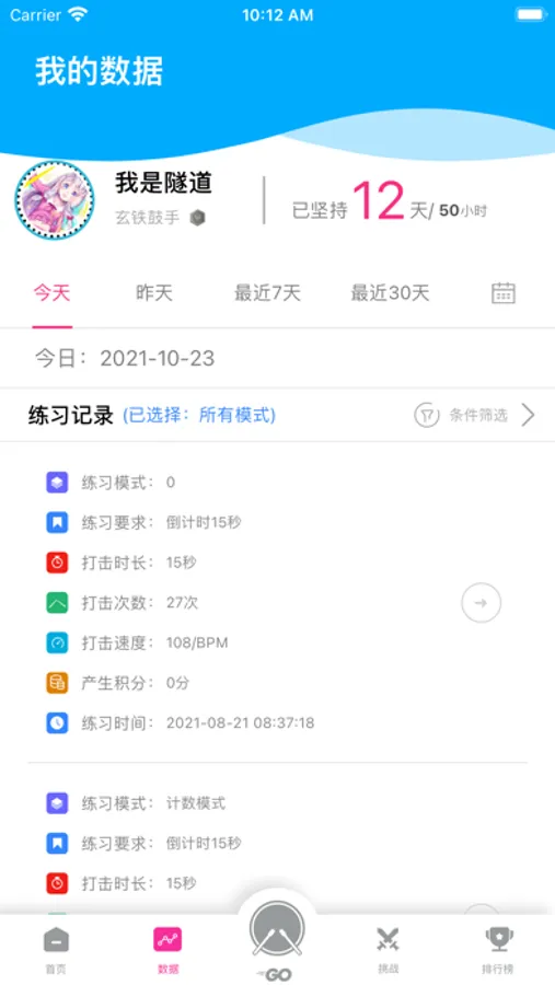 伊起练APP是用户通过手机蓝牙接收到伊起练智能哑鼓,系统将实时展示每次的打击数据,实现测速、计数、节奏、自由练习、在线PK等5种练习模式,精确记录用户每日打击次数和练习时间,并在数据列表和排行榜的形式展示出来。