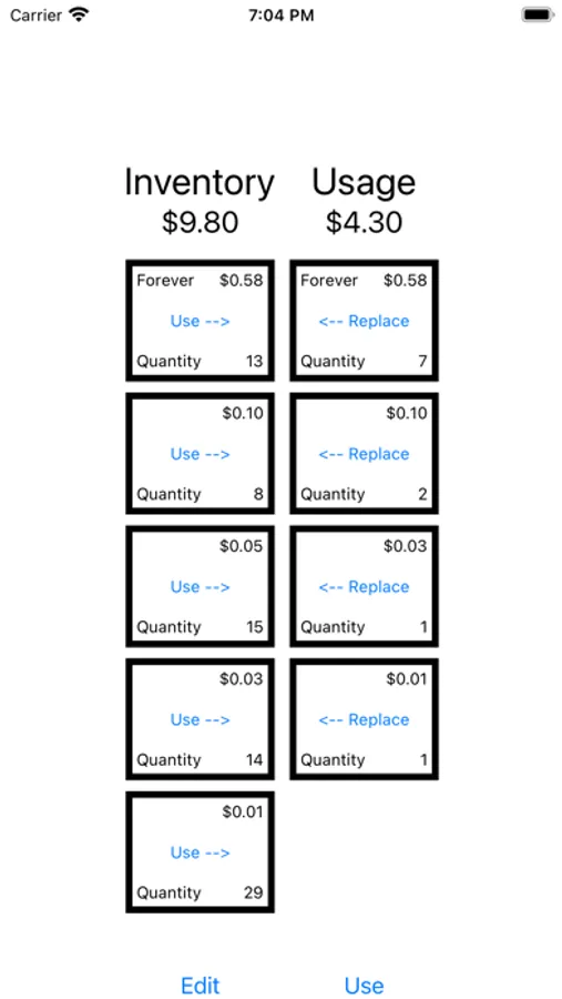 StampManager allows you to keep an inventory of your postage stamps and guides you in selecting a combination to reach a desired total.