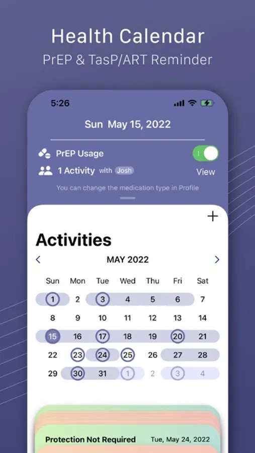 - Log your PrEP history in a calendar view, and compare it with your sex history and protection status in case of any STI/STD exposure.