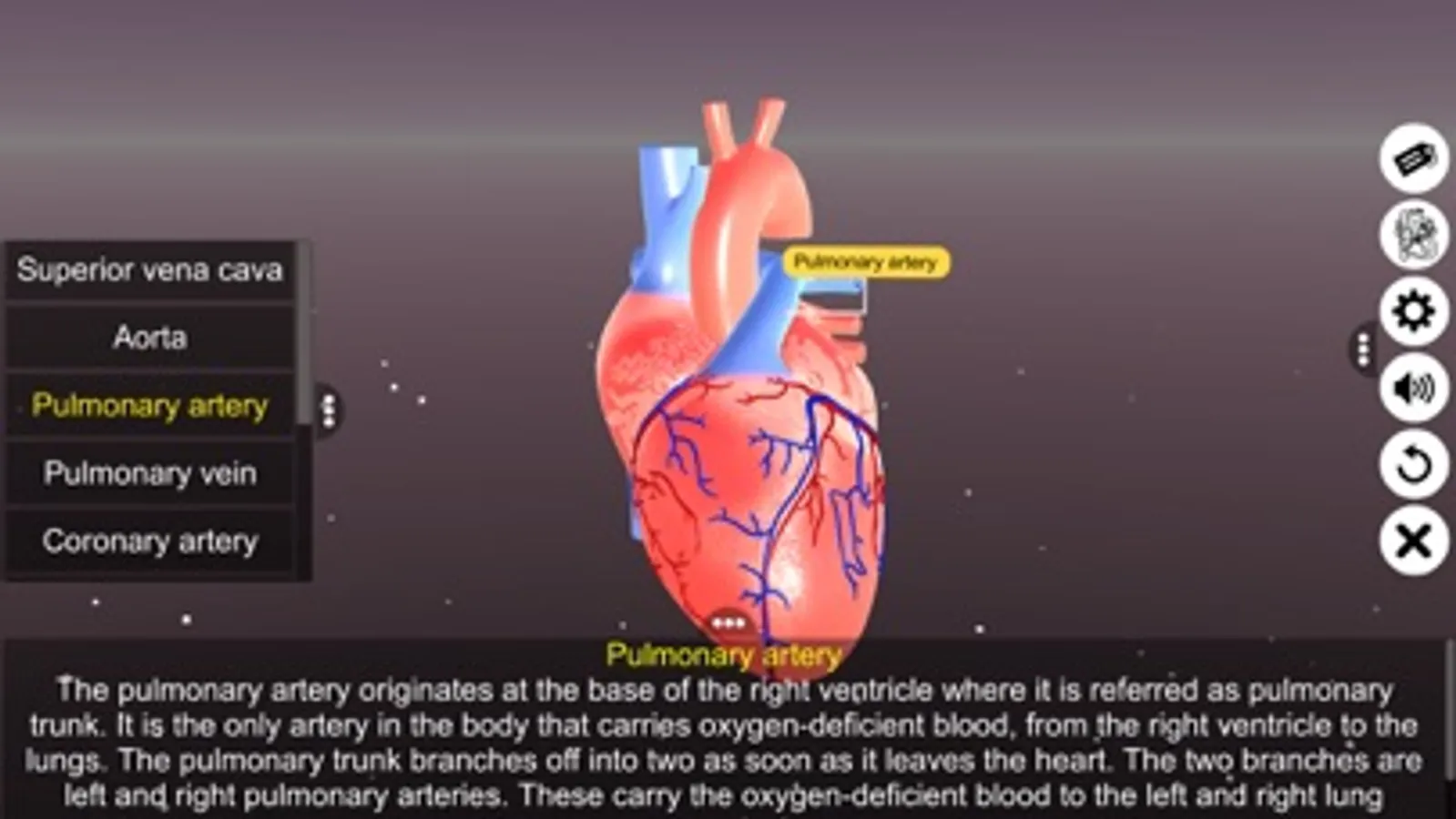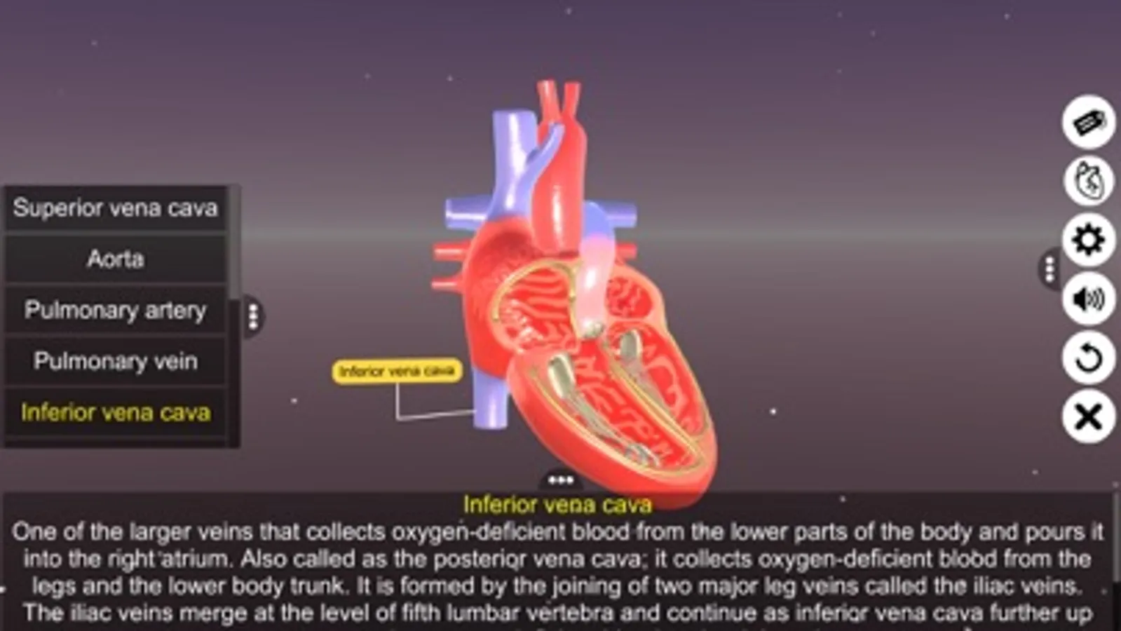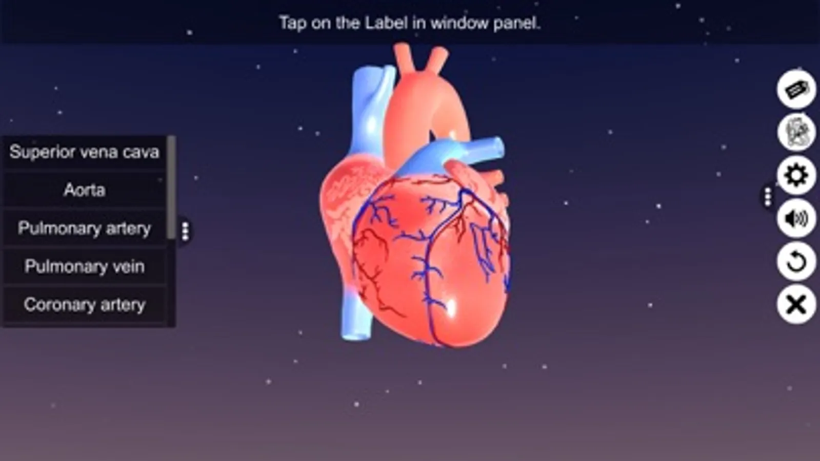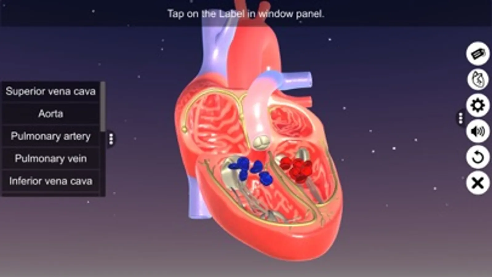 ‘Sections of human heart’ app explains the external and internal structure of human heart through the interactive 3D model to improve the comprehension of the topic. The user can interact with the 3D model by tapping the window labels and getting acquainted with the particular part of the human heart. Tapping the window labels displays the name of the part and also the interactive module is appropriately supported with in depth information about each and every part.
