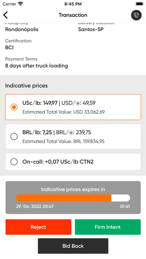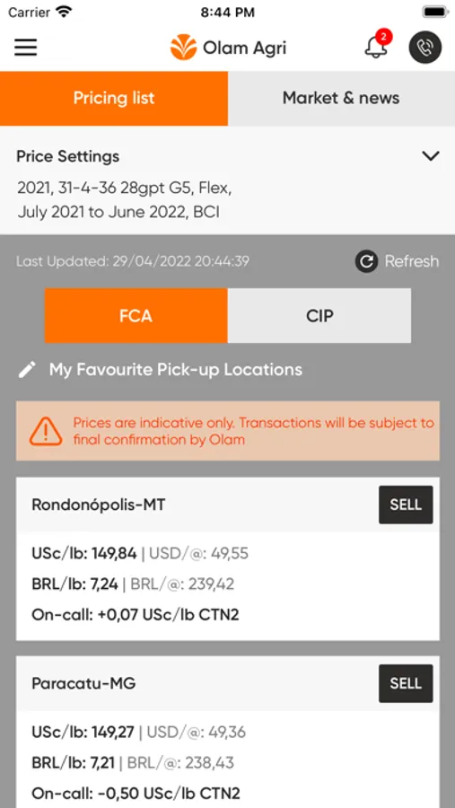 “Olam Direct: Algodão Brasil | Barter app” enables sales representatives from the Barter companies (pre-registered/authorized by Olam) to view live & custom prices trends per distinct cotton types & locations, contract types (FCA, CIP, FOB (soon), Landed Mill (soon) and price types (USD, BRL and OnCall) besides to allow transactions with Olam by assigning farmers previously registered in the platform.