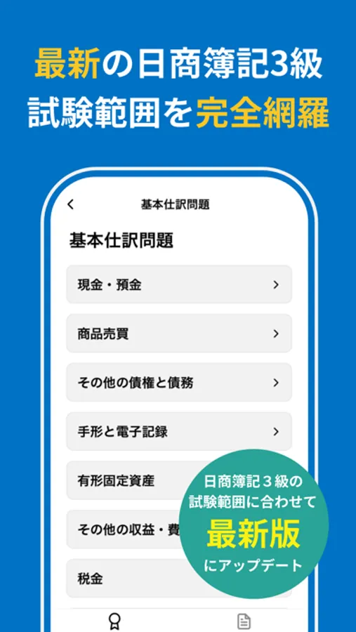 日商簿記3級で試験範囲となる基本仕訳問題を全て網羅しています。(年度ごとのアップデートにも対応)