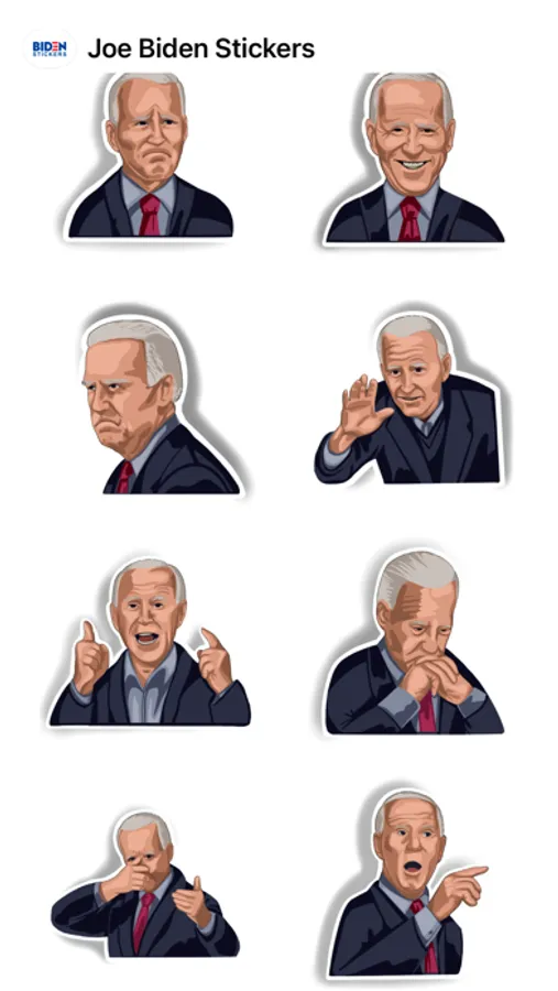 Joe Biden Stickers is an iMessage Sticker Pack providing 12 hand-drawn stickers with faces and gestures of Joe Biden.