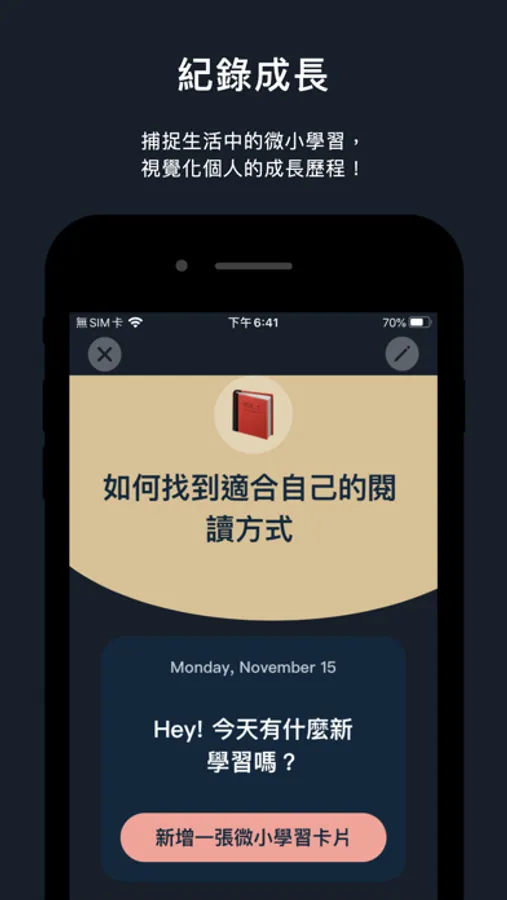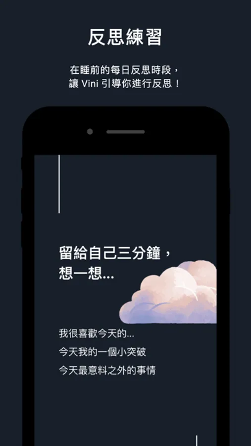 睡前是最好的反思沈澱時間,到了自定的反思時段,Vini 將會帶你進行一次反思練習,你也可以在這段時間,查看信箱最新的來信,當然,這也是新增今日微小學習的絕佳時間!