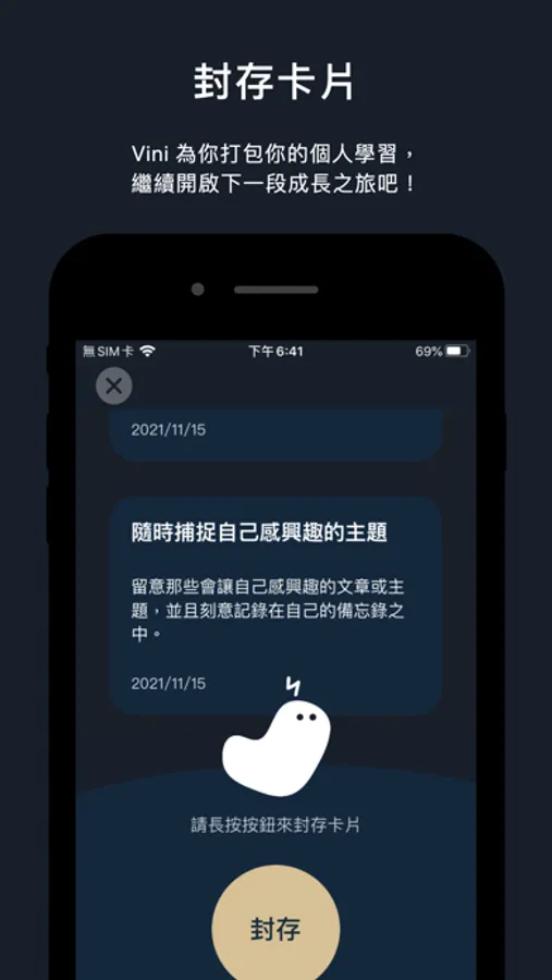 無論你已經達成目標、想要拆解目標、或是對成長項目有了階段性的理解,你都可以在任何時刻,封存與打包你的成長項目。Vini 在封存按鈕上施了一些魔法,現在就試著封存自己的第一張成長項目卡片吧!