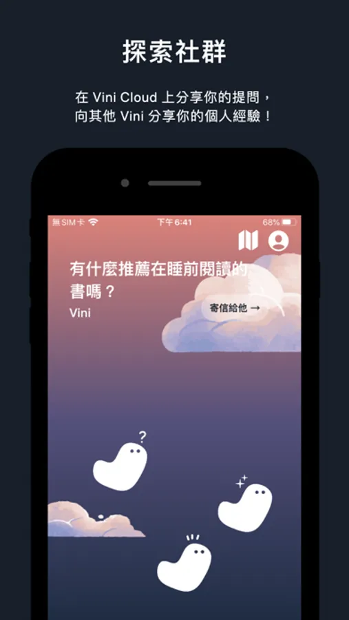 在 Vini Cloud 社群之中,設定好自己的專屬 Vini 角色,盡情探索不同使用者的狀態與探尋吧!對於有共鳴的狀態,你可以寫一封私信給他,也可以在每天晚上收到來自其他 Vini 的最新來信,這些來信,或許也將帶給你全新的啟發。