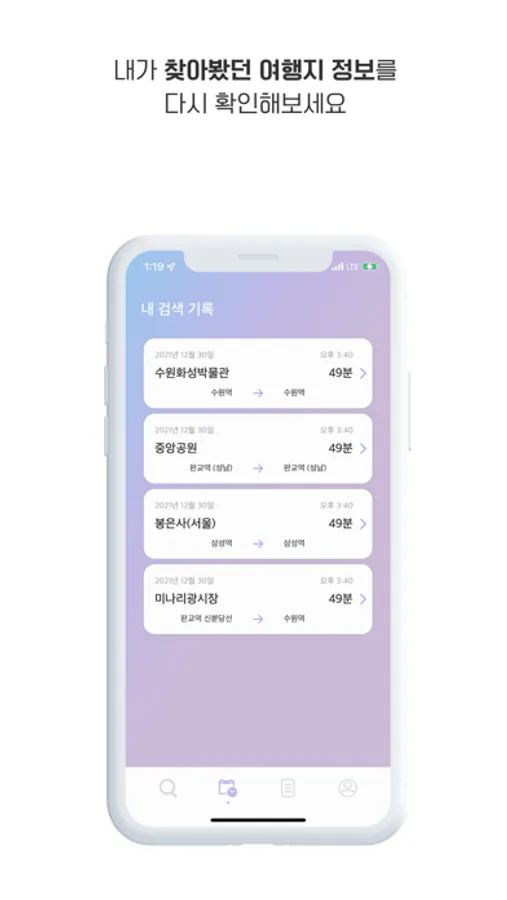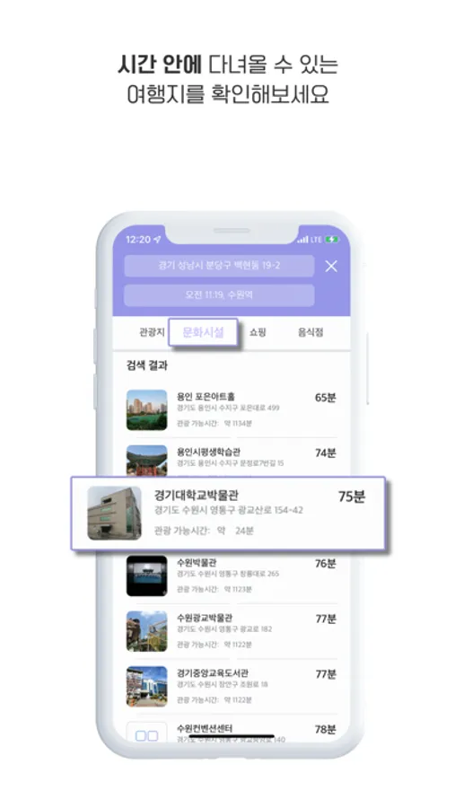 - 정해진 차 시간 전까지 대중교통으로 다녀올 수 있는 여행지 목록을 바로 확인할 수 있습니다.