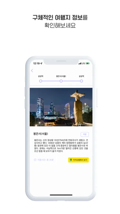 - 여행지 사진과 간단한 설명, 카카오맵 길찾기 정보를 확인할 수 있습니다.