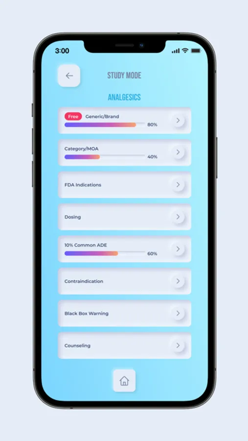 • Study mode: This mode utilizes a unique algorithm that focuses on strengthening users' weaknesses by focusing on questions that the user answers wrong. The system will start with a maximum of 20 questions, which will repeat until you answer the question correctly three times. As you master each question, a new question will be introduced. The study progression will be saved and shown on the study mode's main page so the user can pick up where they left off.