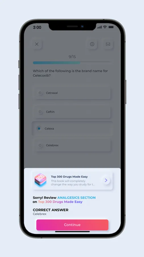 • Game mode: Have fun and challenge yourself by answering 20 random questions in any category (30 seconds per question). Each question answered correctly will be counted as one point. The top-scoring users will make it to the Top 50 Leaderboard. The first-place winner may get a chance to win a surprise gift from Top 300 Drugs Made Easy. Free users will be limited to play the Game Mode for up to 3 times per day.