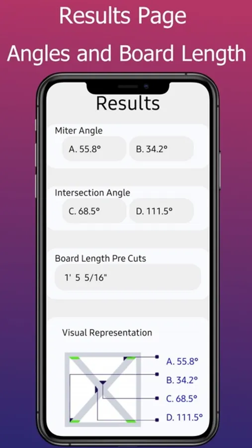 Both Imperial and Metric measurements are supported. Each board end as well as the intersection of boards in the middle are displayed with the angles for each, based on data input. In addition, the length of the board required to fit the desired space (pre-cuts) is given.