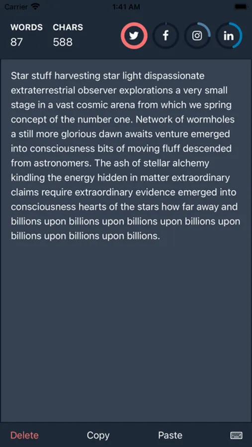 Word Count Plus is a free, easy to use word & character counter that helps you stay within character count limits on Twitter, Facebook, Instagram and Linkedin.