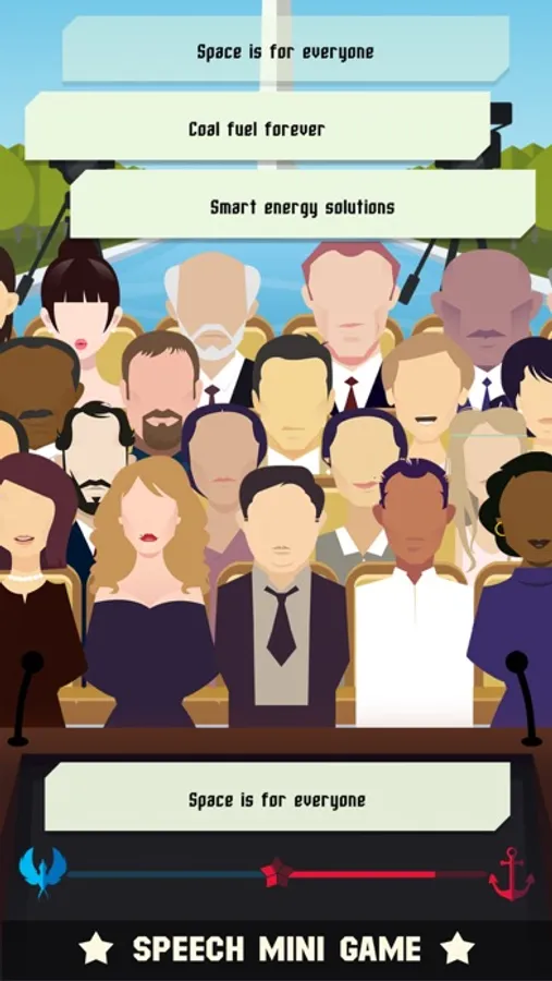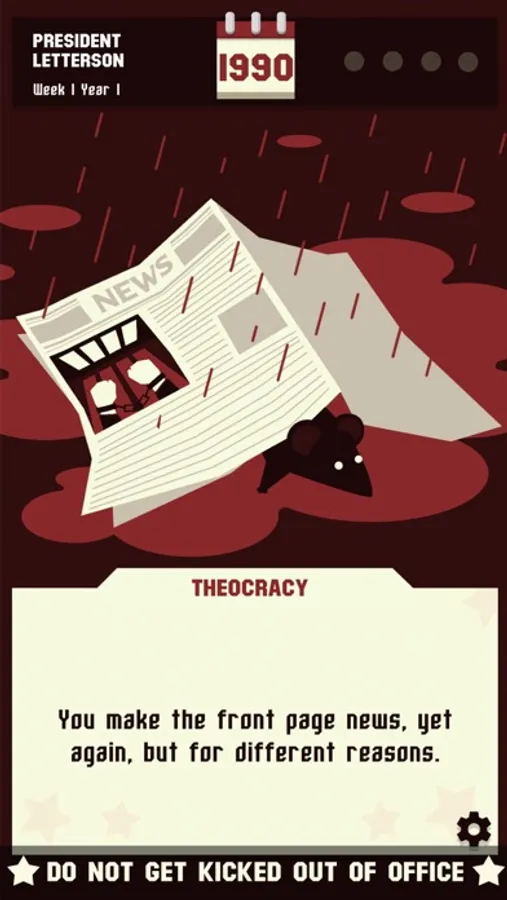 The world is your oyster as you assume the role of the most powerful person in the country. Swipe your presidential fingers left or right to impose your will upon Eagletopia as you listen to requests from your friends, enemies, multiple stooges, and people from both sides of the coin. With each request able to tip the scales, it is up to you to extend your presidential reign for as long as possible; you may lead Eagletopia to success or plunge it into the dark ages… The choice is all yours.