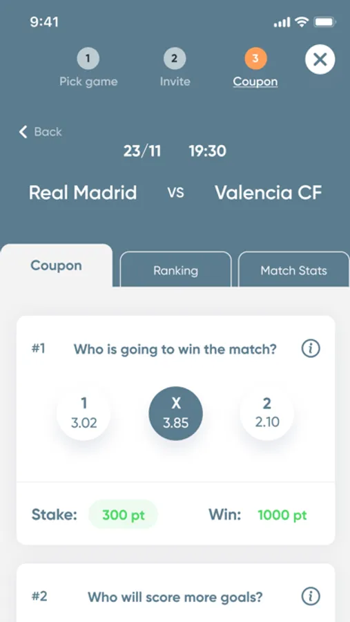 Vælg en kamp og invitér din/dine modstander(e). Så giver SocialBet jer 10 nøje udvalgte væddemål, som udfyldes inden kampstart.