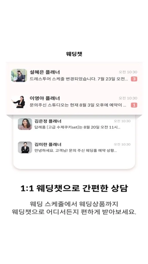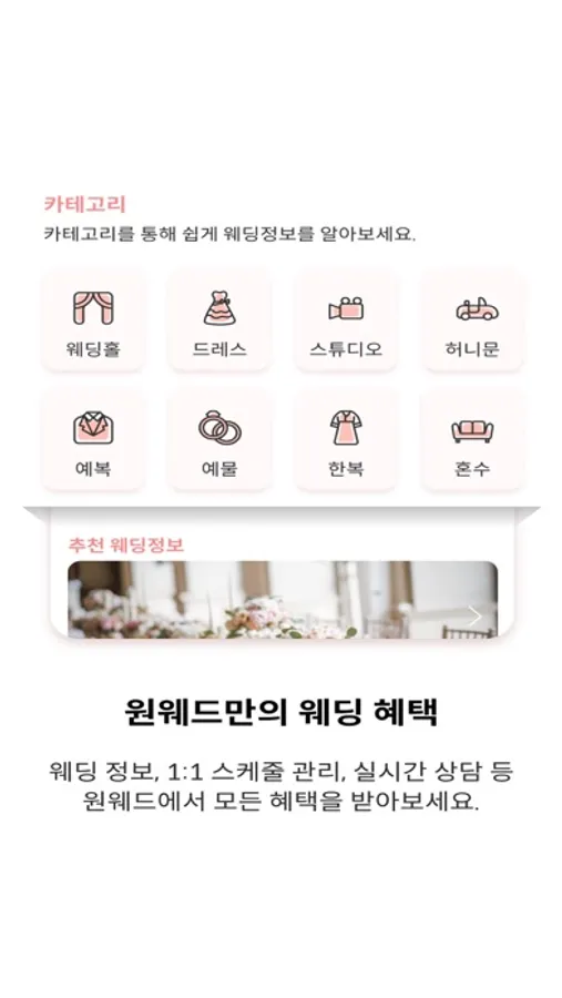 결혼준비에 필요한 정보와 할인혜택을 받을수 있는 공간이며, 결혼예산을 간편하게 등록하여 관리할수 있고 실시간으로 웨딩전문 상담사와 1:1채팅으로 궁금한 웨딩정보를 공유 할수 있습니다. 그리고 스드메, 허니문, 혼수등 특별한 혜택과 이벤트를 받을수 있는 웨딩 필수 앱 입니다.