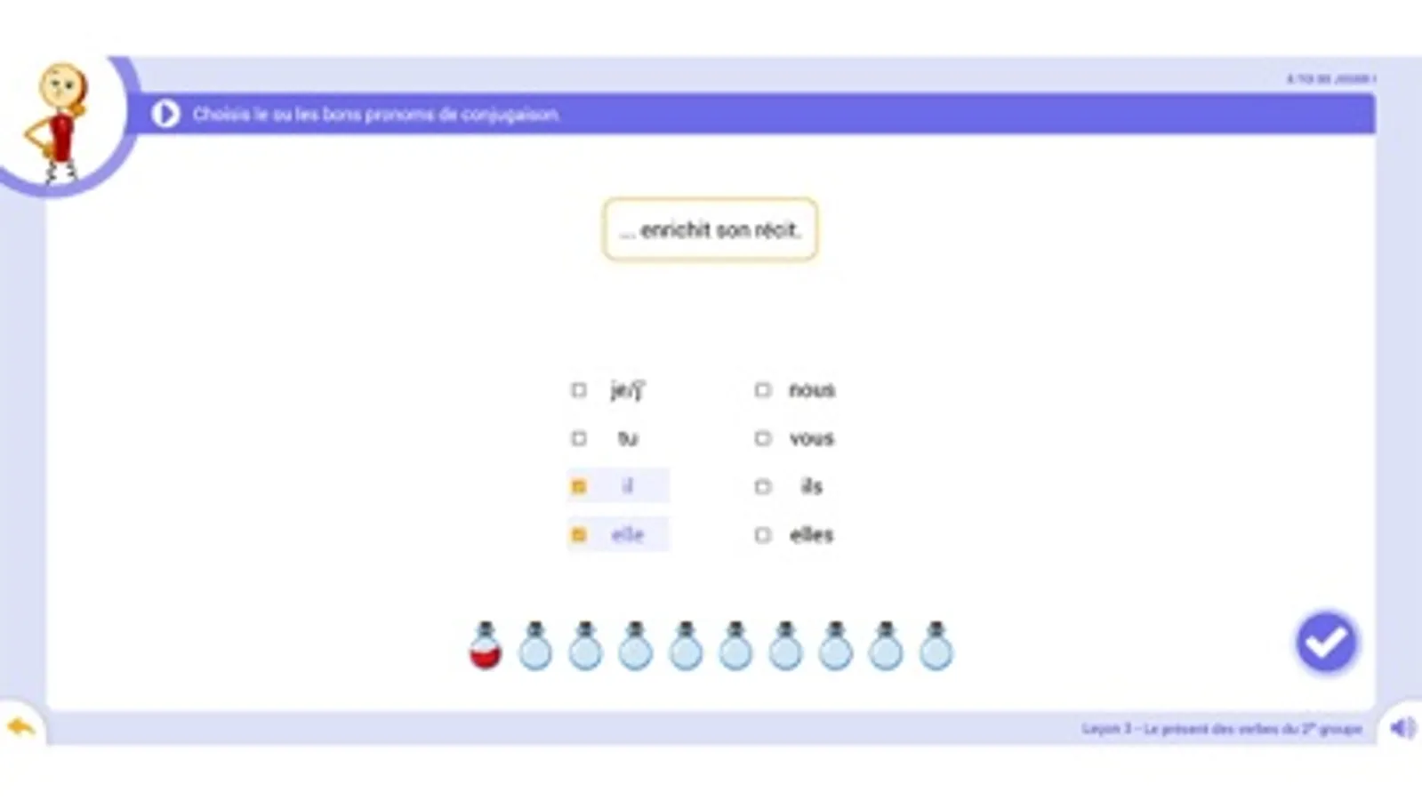 Les Leçons Interactives de Conjugaison permettront aux élèves de découvrir les grandes notions de conjugaison et d’acquérir les compétences suivantes :